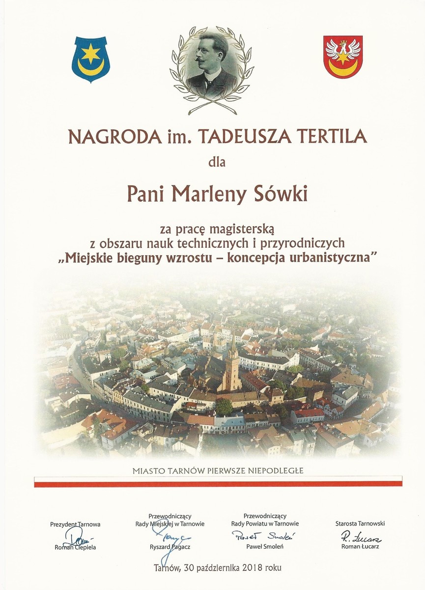 Zwycięska praca dyplomowa “Miejskie bieguny wzrostu - koncepcja urbanistyczna” dotyczyła przekształceń struktury miejskiej Tarnowa. Promotorem pracy była dr inż. arch. Anna Sikora z Zakładu Urbanistyki i Architektury. Nagroda została wręczona podczas uroczystej, wspólnej sesji Rady Miejskiej w Tarnowie i Rady Powiatu Tarnowskiego z okazji 100-lecia odzyskania niepodległości przez Polskę.