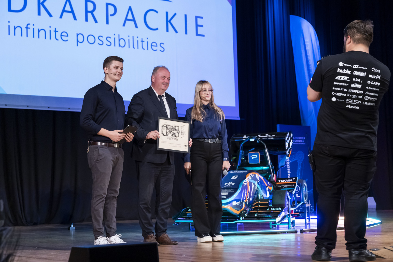 Przedstawiciele PRz Racing złożyli szczególne podziękowania również władzom Politechniki Rzeszowskiej, które dostrzegają potencjał studentów, przyczyniając się do ich rozwoju. „Dzięki Państwa zaangażowaniu możemy rozwijać nasze pasje i realizować ambitne projekty, takie jak nasz najnowszy bolid, ale również godnie reprezentować Politechnikę Rzeszowską na arenie Formuły Student” – mówił Sebastian. Studenci pamiątkową grafikę najnowszego bolidu wręczyli prorektorowi ds. rozwoju i współpracy z otoczeniem prof. dr. hab. inż. Jarosławowi Sępowi, dziekanowi Wydziału Budowy Maszyn i Lotnictwa dr. hab. inż. Adamowi Marcińcowi, prof. PRz oraz opiekunowi koła dr. inż. Piotrowi Strojnemu, który był inicjatorem zespołu. Słowa podziękowania skierowali również do reprezentantów Wydziału Elektrotechniki i Informatyki, którego wsparcie było kluczowe dla zespołu, zwłaszcza w tym sezonie przy budowie pierwszego bolidu elektrycznego.