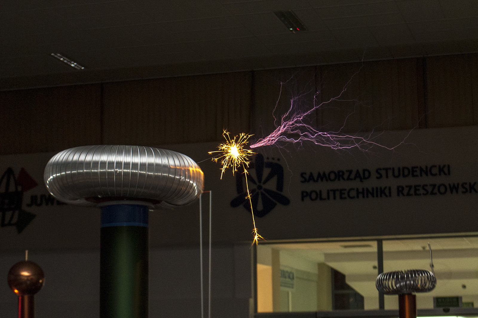 Popularną atrakcją Nocnych Spotkań z Nauką był także „teatr wysokich napięć”, wydarzenie zorganizowane przez firmę Polimedia, partnera Dni Otwartych Politechniki Rzeszowskiej, która współpracuje z uczelnią w ramach Politechniki Dziecięcej. Firma Polimedia przygotowała m.in. spektakl z wykorzystaniem jednych z największych w swoich klasach transformatorów Tesli. Współorganizatorem wydarzenia było Studenckie Koło Naukowe Elektryków „MegaVolt”. Zaprezentowane zostały urządzenia wykonane przez członków koła – generator Van der Graafa, lampowa cewka tesli (VTTC) oraz zademonstrowano wyładowania pod obniżonym ciśnieniem. Wszystkie zawiłości obserwowanych zjawisk i urządzeń wyjaśniał opiekun koła – mgr inż. Sebastian Hajder.