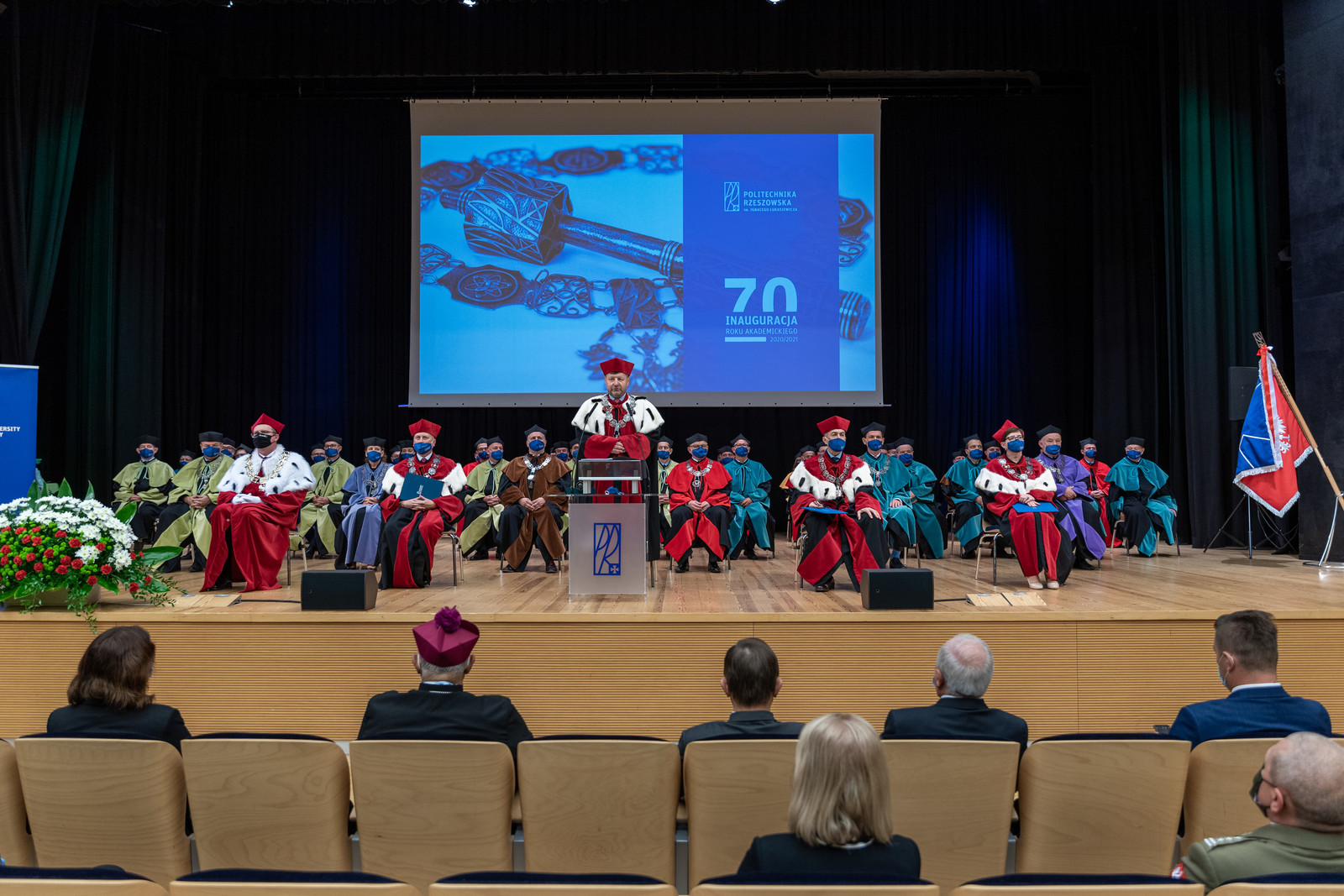 Ze względu na sytuację epidemiczną uroczystość inaugurująca jubileuszowy 70. rok akademicki na naszej uczelni odbyła się w warunkach zaostrzonego reżimu sanitarnego z zachowaniem wszelkich środków ostrożności. Pracownicy, studenci i sympatycy naszej uczelni mogli w niej uczestniczyć w relacji na żywo transmitowanej na kanale YouTube, uczelnianym Facebooku i na antenie Akademickiego Radia i Telewizji Centrum.