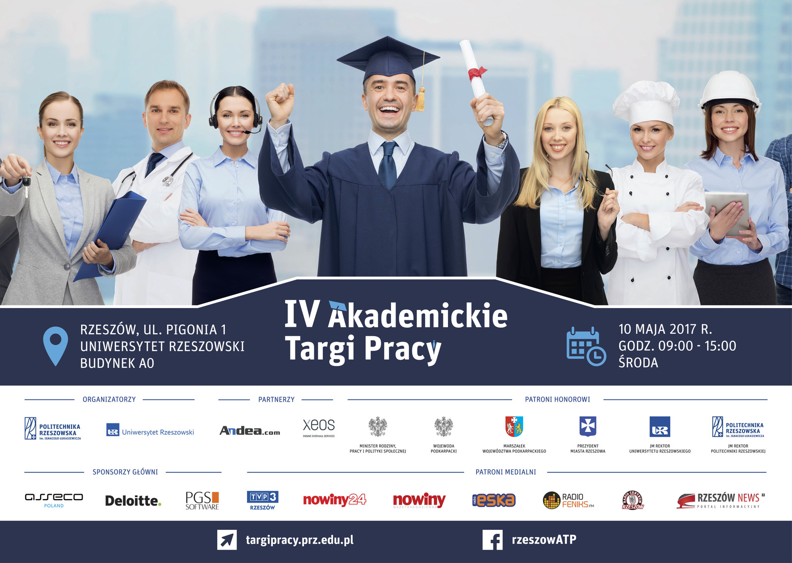 Politechnika Rzeszowska i Uniwersytet Rzeszowski zapraszają na kolejną edycję Akademickich Targów Pracy. Odbędą się one 10 maja 2017 r. w budynku Uniwersytetu Rzeszowskiego przy ul. Pigonia 1.