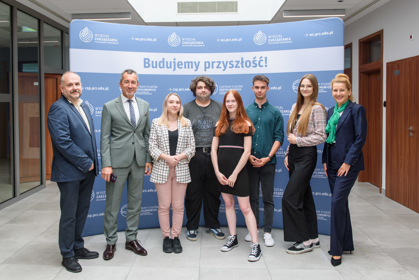 Zespół Hossa Bank z dr. inż. M. Sołtysiakiem (pierwszy z lewej), prorektorem ds. studenckich prof. G. Ostaszem (drugi z lewej), dziekan Wydziału Zarządzania prof. PRz Beatą Zatwarnicką-Madura (pierwsza z prawej),