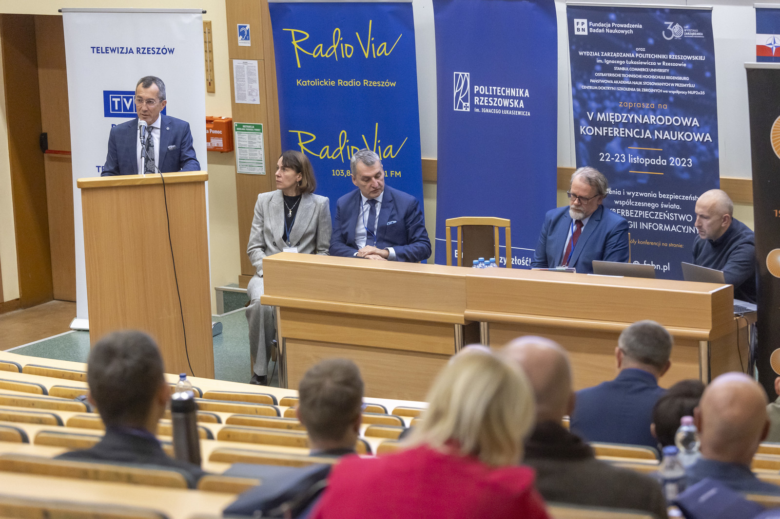 Przedstawicieli instytucji, urzędów, formacji, służb specjalnych, wymiaru sprawiedliwości, środowisk naukowych oraz studentów przywitała dr hab. Izabela Oleksiewicz, prof. PRz. Konferencję otworzył prorektor ds. studenckich naszej uczelni prof. dr hab. Grzegorz Ostasz. Głos zabrali również: dziekan Wydziału Zarządzania dr hab. Beata Zatwarnicka-Madura, prof. PRz, członek Zarządu Województwa Podkarpackiego Stanisław Kruczek oraz Sławomir Świder działający w imieniu zastępcy prezydenta Rzeszowa. W wydarzeniu uczestniczyli również: dyrektor Departamentu Strategii Polityki Zagranicznej Ministerstwa Spraw Zagranicznych dr hab. Jacek Reginia-Zacharski, prof. UŁ, ekspert Ministerstwa Spraw Zagranicznych dr hab. Radosław Bania, Marek Kołtuna z Ministerstwa Obrony Narodowej, dyrektor Centrum Prewencji Terrorystycznej Anna Tarkowska, Sławomir Gola z Departamentu Informatyzacji, Ministerstwo Klimatu i Środowiska, radny Miasta Rzeszowa Witold Walawender, międzynarodowy przedstawiciel Uczelni OTH w Regensburgu prof. Marcus Beresinsky, prorektor ds. studenckich Akademii Sztuki Wojennej prof. dr hab. Jarosław Gryz, dyrektor Centrum Doktryn i Szkolenia Sił Zbrojnych płk. dr Andrzej Lis, przewodniczący dyscypliny bezpieczeństwo wewnętrzne na naszej uczelni prof. dr hab. Marcin Jurgilewicz.